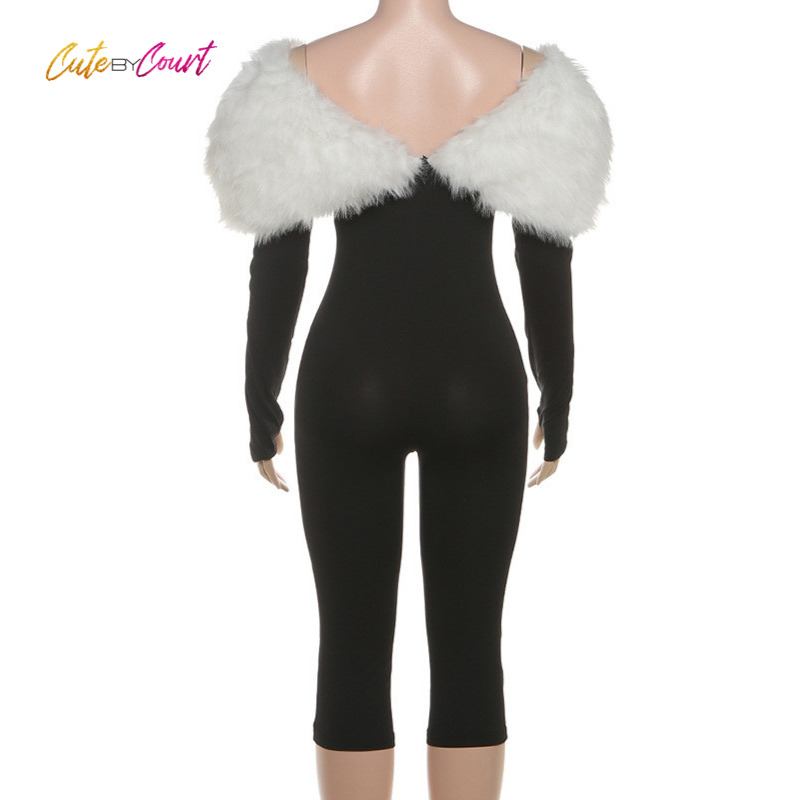 Turn heads in Arctic Allure, a statement romper designed for bold nights and unforgettable entrances. This body-hugging piece features an off-the-shoulder faux fur neckline, a front cut-out detail near the stomach, and finger loop sleeve detailing that keeps the sleeves perfectly in place.